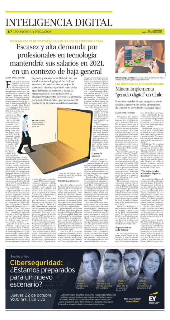 Este artículo fue publicado en El Mercurio el día lunes 19 de octubre del 2020 por Ramón Rivera Notario. Puesta en marcha de una maqueta virtual facilita la supervisión de las operaciones de la mina en vivo desde cualquier lugar. Un ejemplo de “minería 4.0” acaba de ser implementado en Chile. Es “gemelo digital” de […]